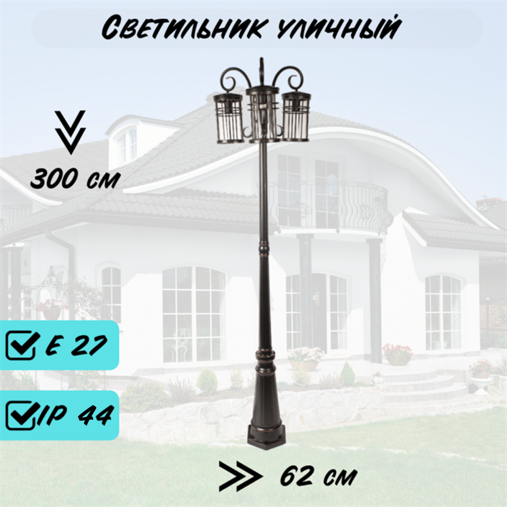 Уличный наземный высокий светильник c 3-мя плафонами M 300*62см Е27 черный/медь IP44