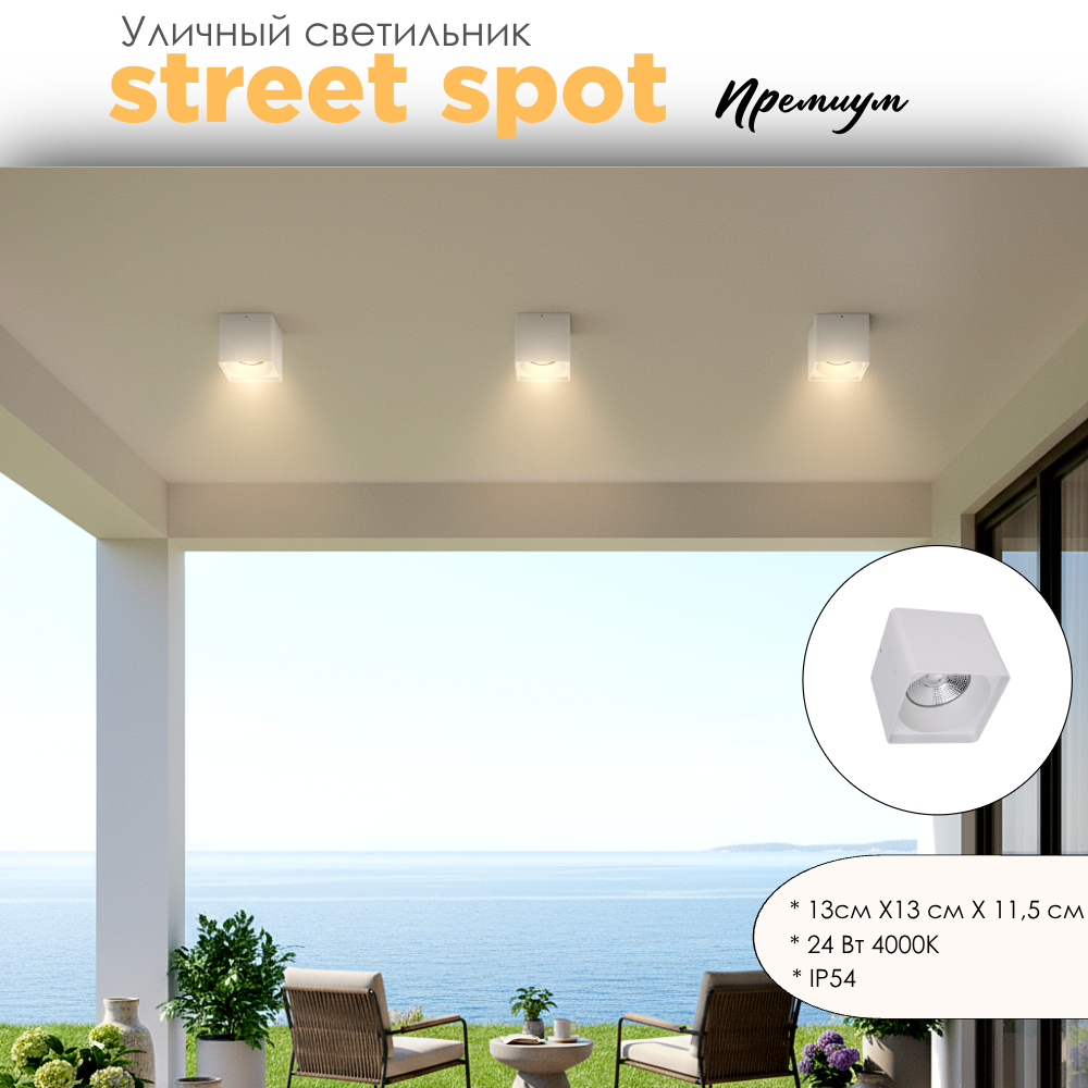 Светильник уличный потолочный квадратный, IP54, 24Вт, 4000К, белый / черный Современный влагозащищённый светильник предназначен для основного и декоративного освещения как в помещениях, так и на улице. Квадратная форма с аккуратной внутренней ступенькой и лаконичным рассеивателем делает модель стильной и универсальной — она подходит для террас, веранд, фасадов, кафе, коридоров и подсобных помещений. Корпус выполнен из прочного алюминиевого сплава и стекла, покрыт порошковой краской, защищающей от коррозии и воздействия влаги. Встроенный COB-светодиод мощностью 24 Вт обеспечивает мягкий равномерный свет с нейтральной цветовой температурой 4000K, при этом отличается экономичностью и долгим сроком службы. Компактные размеры и высокий класс защиты IP54 позволяют использовать светильник в различных зонах — от жилых до общественных. Характеристики Параметр Значение Материал корпуса алюминиевый сплав, стекло Номинальное напряжение AC 85–265V, 50/60Hz Мощность 24W Световой поток 2400 лм ±5% Температура света 4000K Тип светодиода LED, COB Угол излучения 75° Индекс цветопередачи (CRI) ?80Ra Фактор мощности (PF) ?0.9 Габариты (Д*Ш*В) 130*130*115 мм Степень защиты IP54 Диапазон температур эксплуатации ?20° ~ +40°C Цвет корпуса Белый