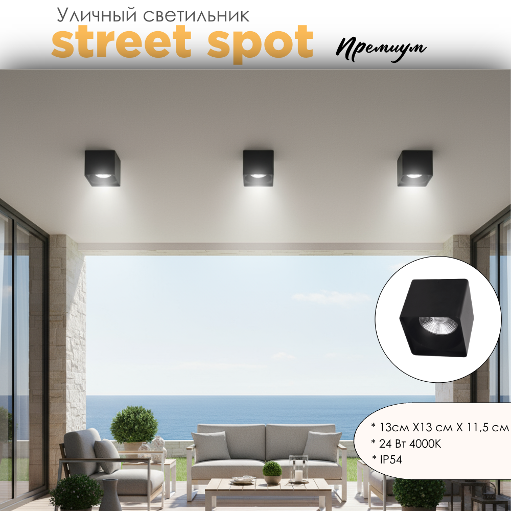 Светильник уличный потолочный квадратный, IP54, 24Вт, 4000К, белый / черный Современный влагозащищённый светильник предназначен для основного и декоративного освещения как в помещениях, так и на улице. Квадратная форма с аккуратной внутренней ступенькой и лаконичным рассеивателем делает модель стильной и универсальной — она подходит для террас, веранд, фасадов, кафе, коридоров и подсобных помещений. Корпус выполнен из прочного алюминиевого сплава и стекла, покрыт порошковой краской, защищающей от коррозии и воздействия влаги. Встроенный COB-светодиод мощностью 24 Вт обеспечивает мягкий равномерный свет с нейтральной цветовой температурой 4000K, при этом отличается экономичностью и долгим сроком службы. Компактные размеры и высокий класс защиты IP54 позволяют использовать светильник в различных зонах — от жилых до общественных. Характеристики Параметр Значение Материал корпуса алюминиевый сплав, стекло Номинальное напряжение AC 85–265V, 50/60Hz Мощность 24W Световой поток 2400 лм ±5% Температура света 4000K Тип светодиода LED, COB Угол излучения 75° Индекс цветопередачи (CRI) ?80Ra Фактор мощности (PF) ?0.9 Габариты (Д*Ш*В) 130*130*115 мм Степень защиты IP54 Диапазон температур эксплуатации ?20° ~ +40°C Цвет корпуса Черный