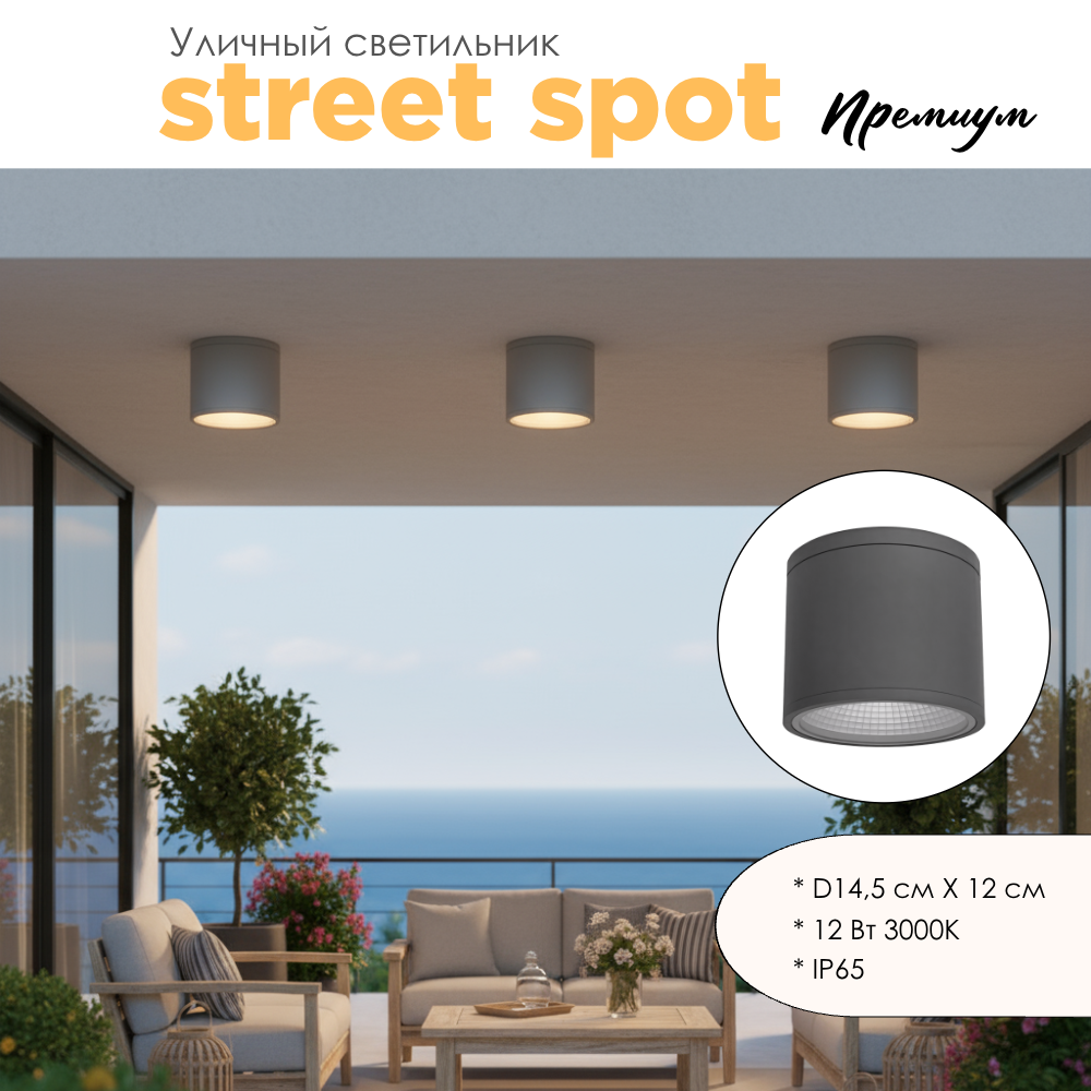 Уличный потолочный светодиодный светильник накладной влагозащищенный 14.5*12см IP65 12Вт 2700К серый — современное и надёжное решение для основного и декоративного освещения как внутри, так и снаружи помещений. Благодаря высокой степени защиты IP65, светильник устойчив к воздействию влаги и пыли, что делает его идеальным выбором для террас, навесов, входных зон и фасадов. Корпус выполнен из прочного алюминиевого сплава со стеклянным рассеивателем и покрыт порошковой краской, которая защищает от коррозии и сохраняет привлекательный внешний вид в течение долгого времени. Встроенный светодиод CREE COB обеспечивает мягкое тёплое свечение (2700К), равномерное распределение света и экономичное энергопотребление. Надёжный LED-драйвер гарантирует стабильную работу и сохранение световых характеристик на протяжении всего срока службы. Характеристики: Материал — алюминиевый сплав, стекло Номинальное напряжение — AC 85–265V 50/60Hz Мощность — 12 Вт Световой поток — 1200 лм Температура света — 2700K Класс цветопередачи (Ra) — ?80 Размеры (Д*В) — 145*120 мм Тип источника света — LED, COB, CREE Степень защиты — IP65 Цвет корпуса — серый