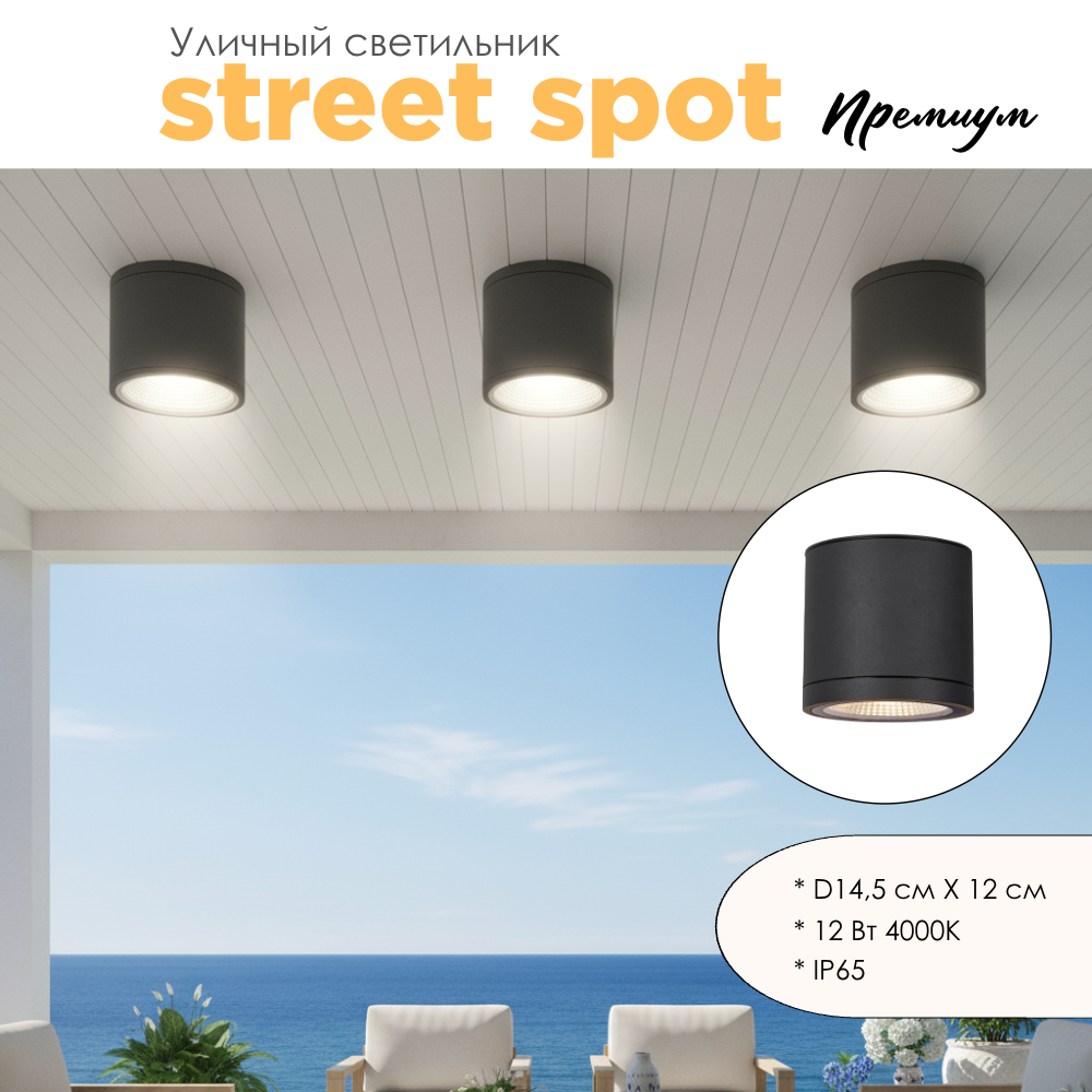Уличный потолочный светодиодный светильник накладной влагозащищенный 14.5*12см IP65 12Вт 4000К черный — современное и надёжное решение для основного и декоративного освещения как внутри, так и снаружи помещений. Благодаря высокой степени защиты IP65, светильник устойчив к воздействию влаги и пыли, что делает его идеальным выбором для террас, навесов, входных зон и фасадов.