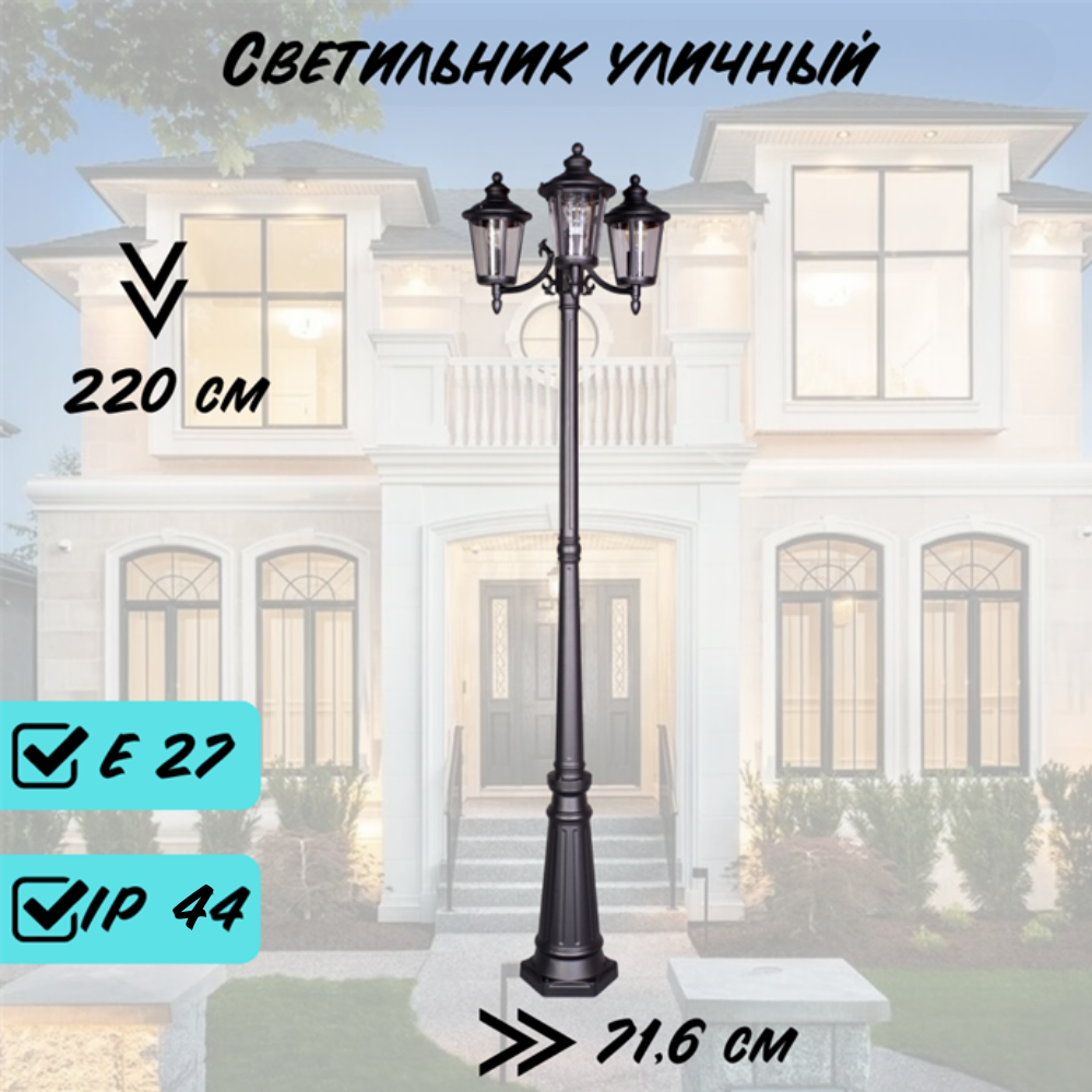 Уличный высокий наземный светильник с 3-мя плафонами 220*71,6*26см Е27 черный IP44